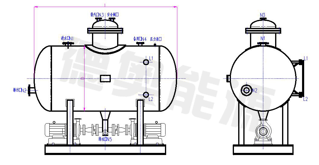 2、根據(jù)所需回收的凝結(jié)水量選取設(shè)備處理容量,設(shè)備型式立臥式選擇,原則上處理量50t/h以下建議使用立式,處理量大于50t/h或設(shè)備容積大于10立方米建議使用臥式;