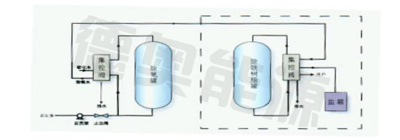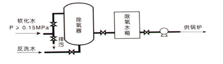 供熱水鍋爐或水質(zhì)要求相同的用戶時(shí),軟化水經(jīng)由集控閥進(jìn)入除氧器上部,經(jīng)海綿鐵過(guò)濾除氧后,由除氧器下部流出,再經(jīng)集控閥流向鍋爐或除氧水箱。反洗時(shí),若水壓不足時(shí),控制器發(fā)出信號(hào),反洗泵啟動(dòng),反洗水由除氧器下部流入,將海綿鐵中的沉淀物帶起經(jīng)集控閥排污口排出。