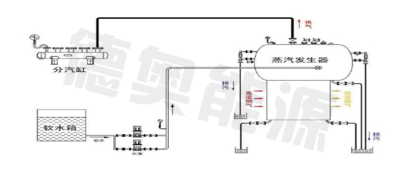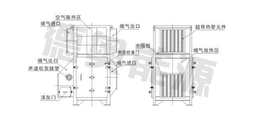 工作原理是高溫的煙氣流經(jīng)回收器是,煙氣的熱量傳給傳熱元件,傳熱元件將熱量傳給鍋爐供水。鍋爐供水溫度升高,排煙溫度降低。煙氣的部分熱能得到回收利用。